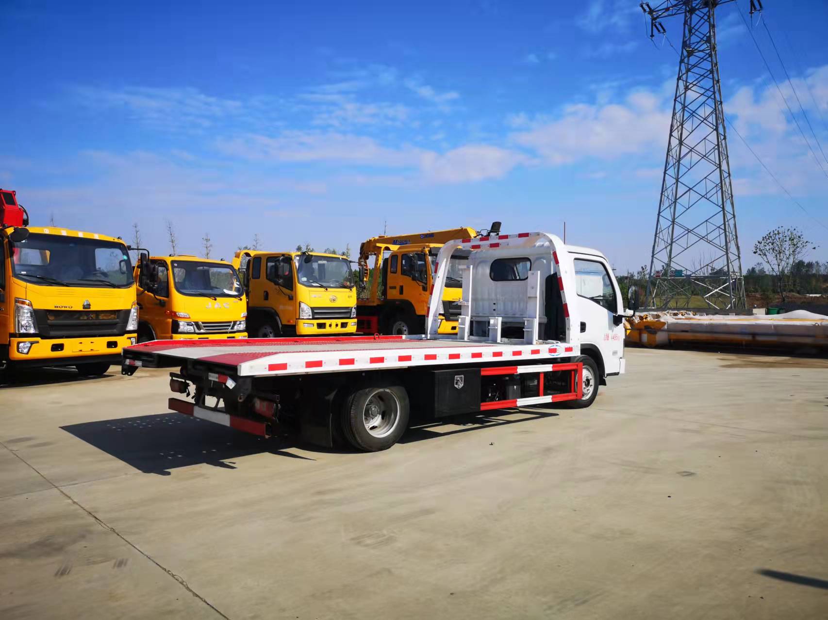 3噸上裝,4噸卷揚,21米鋼絲繩,底板為高強鋼沖孔板,板長4.2米,寬2.3米,配四根捆綁帶,擋胎板2個,工具箱一個,LED工作照明燈,其余標配。